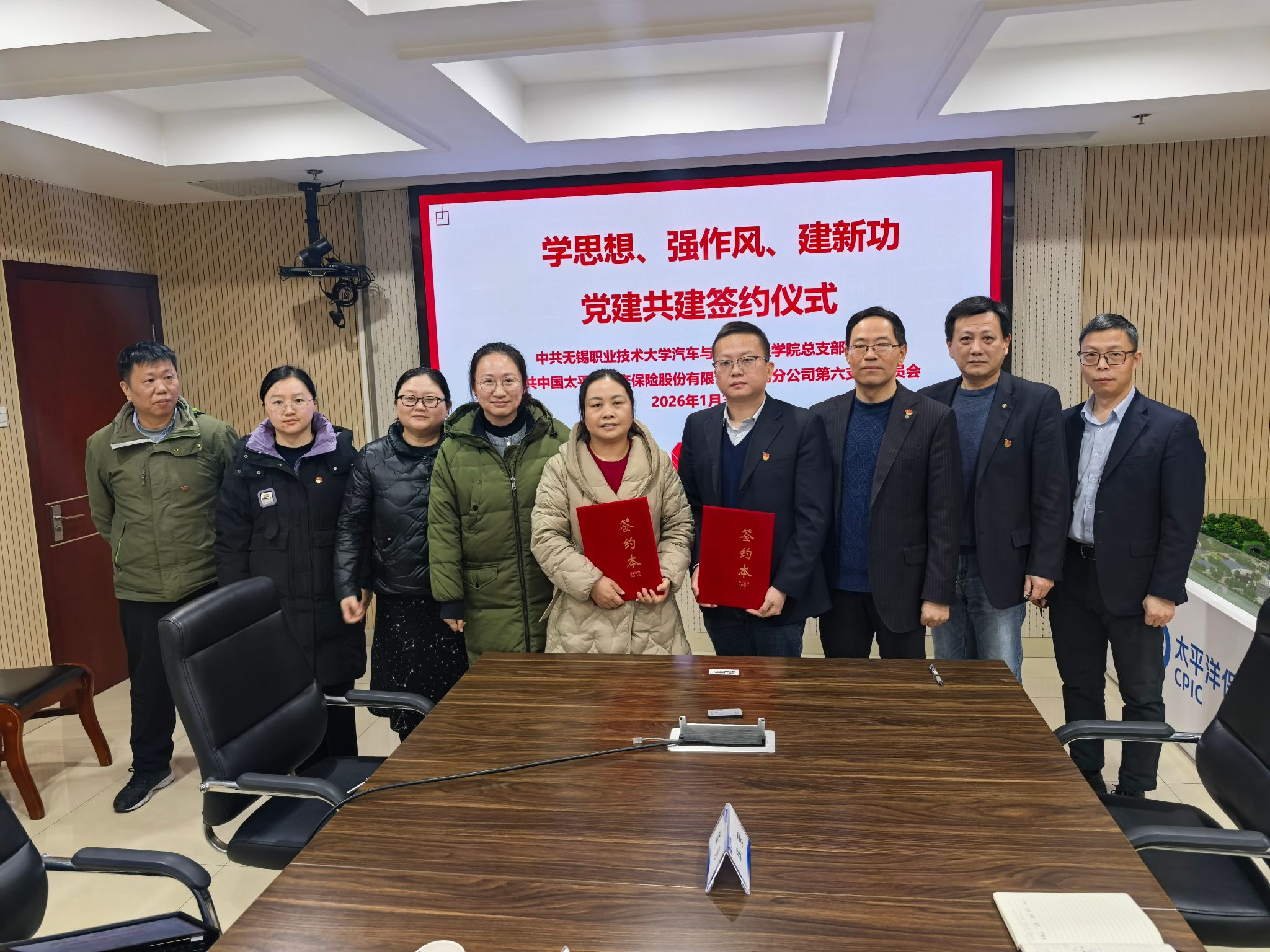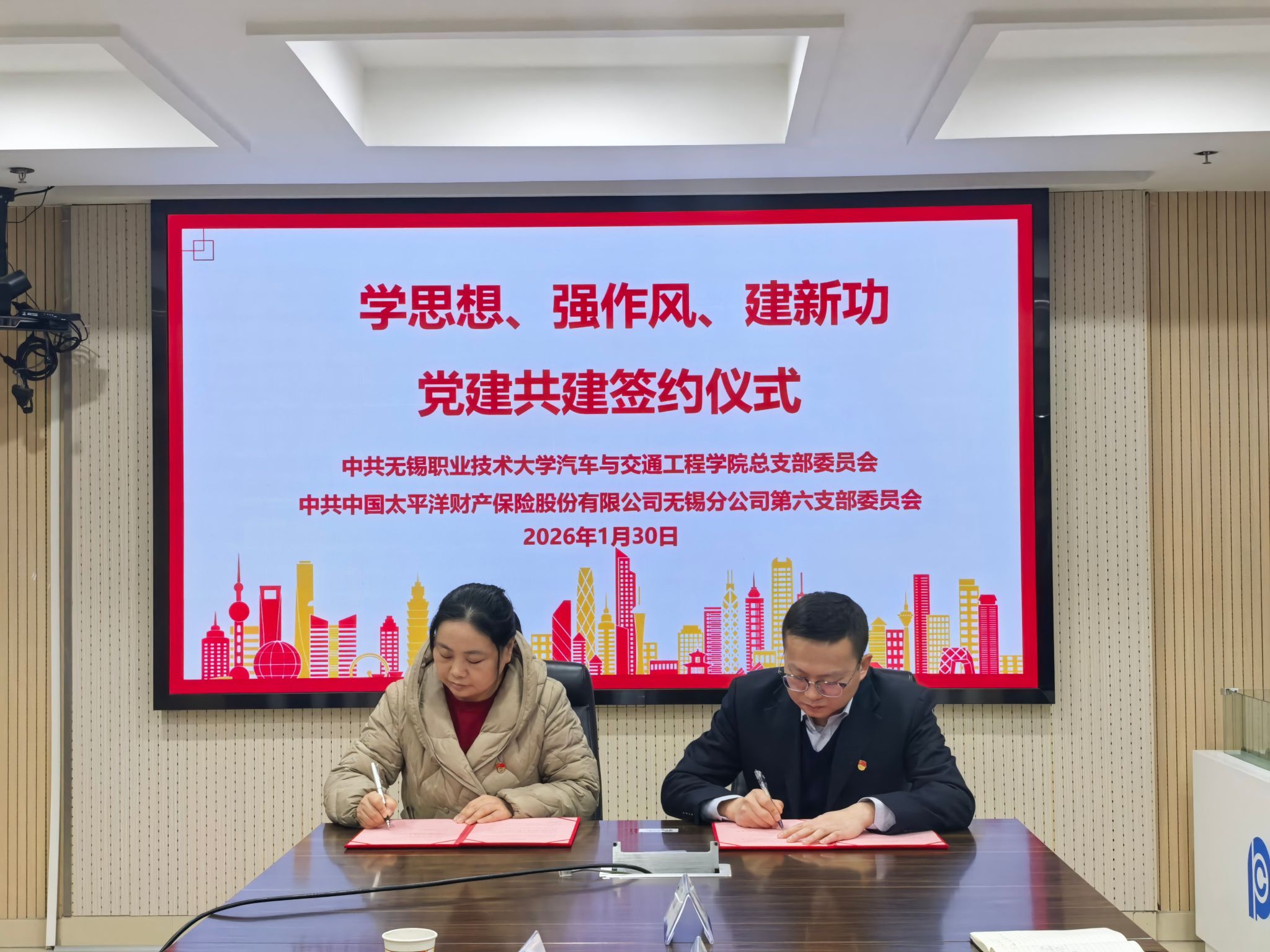 为深入学习贯彻习近平新时代中国特色社会主义思想,探索党建引领下校企合作新模式,2026年1月30日下午,汽车与交通工程学院党总支书记张美娟带领学院教工代表一行,赴太平洋财产保险股份有限公司无锡分公司,与该公司第六党支部举行“学思想、强作风、建新功”党建共建签约仪式。