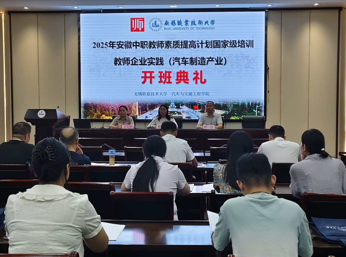 2025 年 8 月 2 日上午,2025 年安徽省职业院校教师素质提高计划国家级培训 —— 教师企业实践(汽车制造产业)培训班开班仪式,在无锡职业技术大学国际交流中心第二报告厅举行。学校党委副书记杨雪琴、继续教育与培训部主任饶成明、汽车与交通工程学院党总支书记张美娟以及培训班全体学员共同出席仪式。