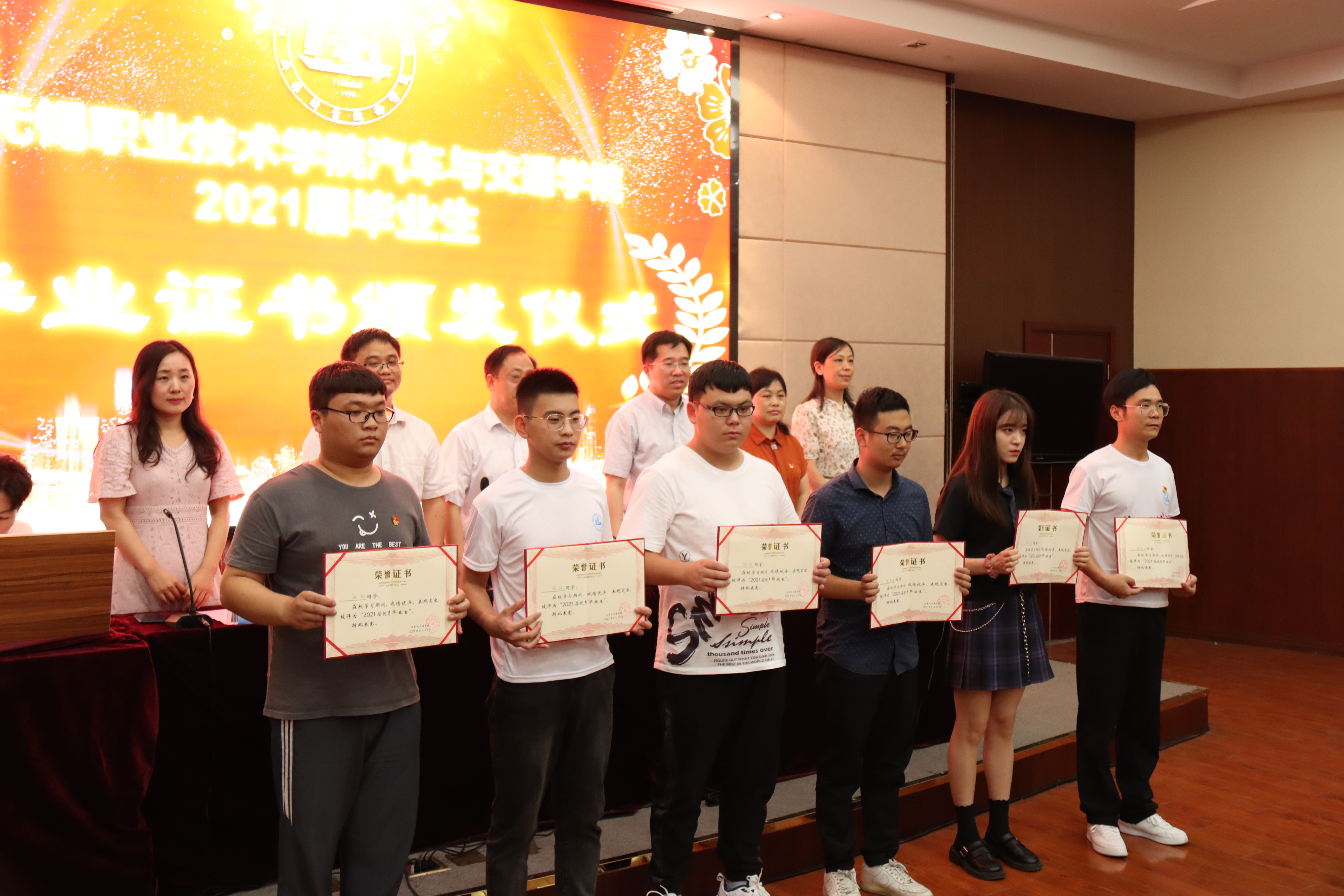 毕业典礼上,汽车与交通学院党总支书记兼院长邹晔教授宣布了2021届汽车与交通学院2021届毕业生毕业情况,党总支副书记丁正荣副教授宣布了荣获2021届优秀毕业生名单,台上全体领导为2021届优秀毕业生颁发了荣誉证书,并为毕业生代表颁发了毕业证书。