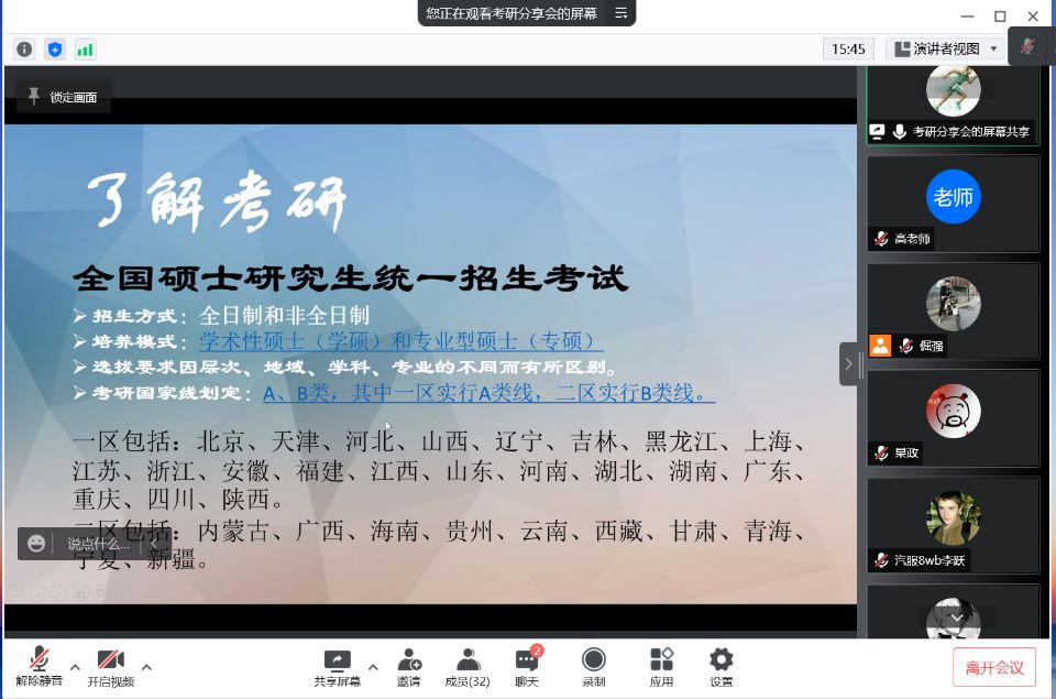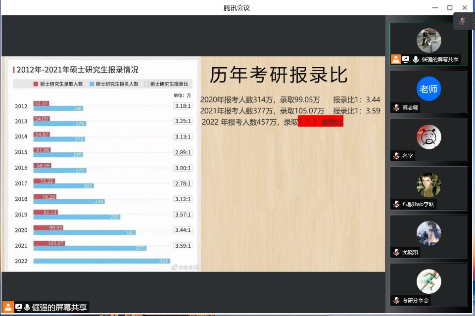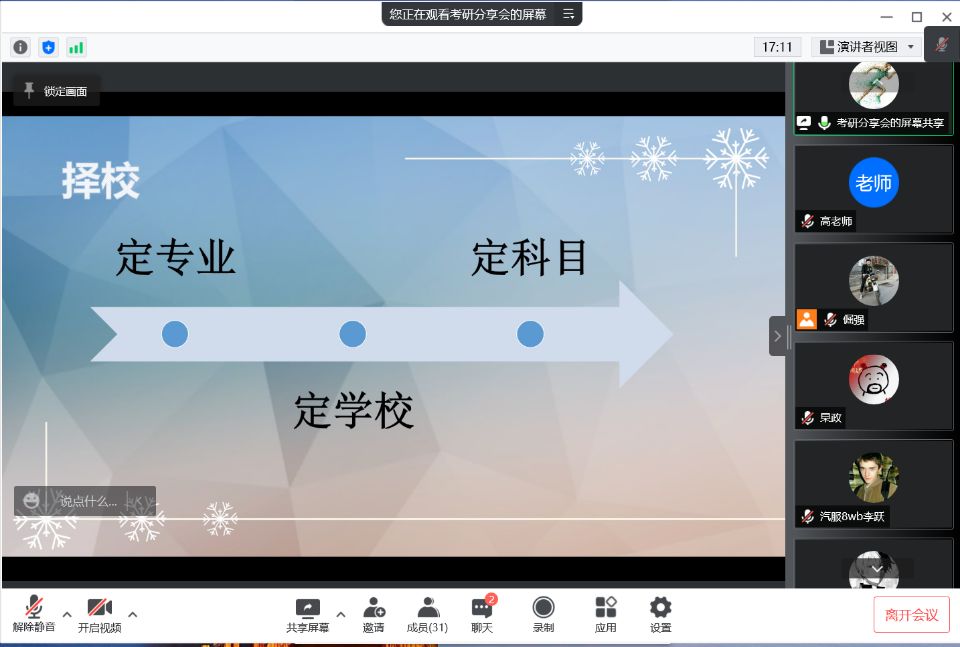 为进一步加强同学们对研究生入学考试的认识、明确考研目标、掌握相关考研技巧,汽车与交通学院于2022年3月17日18点30分举办了线上考研分享会。本科班8WB班主任高娜娜老师出席了本次分享会。