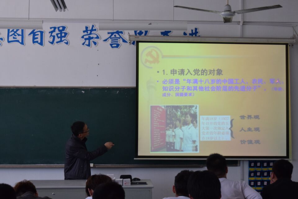 郭再泉书记从申请入党的条件,党员的基本条件,党员的义务与权利三方面为我们详细阐述了党员的标准。首先是申请入党的条件,特别值得注意的是,党的十八大根据我国经济发展和社会阶层结构变化的实际,在党员条件部分第一次把“其他社会阶层的先进分子”纳入申请入党的对象,体现了中国共产党的先进性。这要求同学们要积极进取,奋发有为,提升自己的党性修养和对党的精神的认知。接着郭书记又讲到了中国共产党党员的基本条件,第一点共产党党员是中国工人阶级的有共产主义觉悟的先锋战士,第二点共产党党员要全心全意为人民服务,这要求同学们要不求回报,无私奉献,积极献身于党的工作事业中。最后郭书记又为我们讲解了党员的八项权利与八项义务,使同学们对中国共产党党员的权利与义务有了更加直观的认识和了解。整节课,郭书记不仅熟练的引用了党的纲领和章程,也用了他几十年的老党员经历和经验对同学们进行了谆谆教诲,将课堂与生活紧密联系在一起,生动形象,绘声绘色。