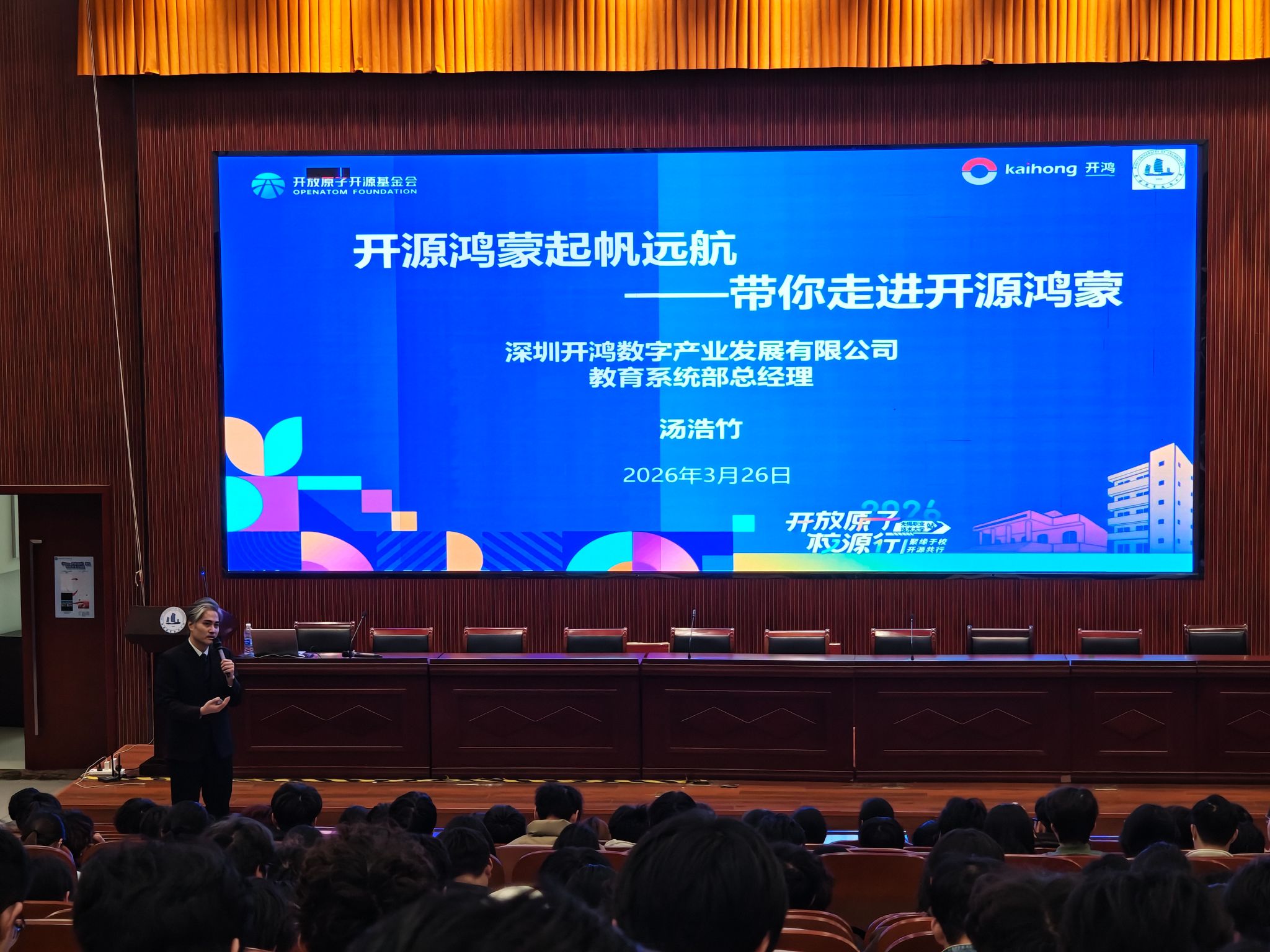 深圳开鸿数字产业发展有限公司(以下简称“深开鸿”)教育系统部总经理汤浩竹分享题为《扬帆起航,带你走进开源鸿蒙》的报告,为高校师生带来开源鸿蒙全景解读。汤浩竹从开源鸿蒙的诞生背景与使命愿景出发,深入剖析国家战略推广背后的深远意义,厘清开源鸿蒙技术底座与开源鸿蒙生态的协同关系,揭秘"一次开发,多端部署"等核心技术创新,并结合智能制造、智慧城市等真实应用场景,展现基于开源鸿蒙的KaihongOS赋能千行百业的实践蓝图。助力职业院校师生把握国产基础软件发展机遇,投身开源鸿蒙生态建设。