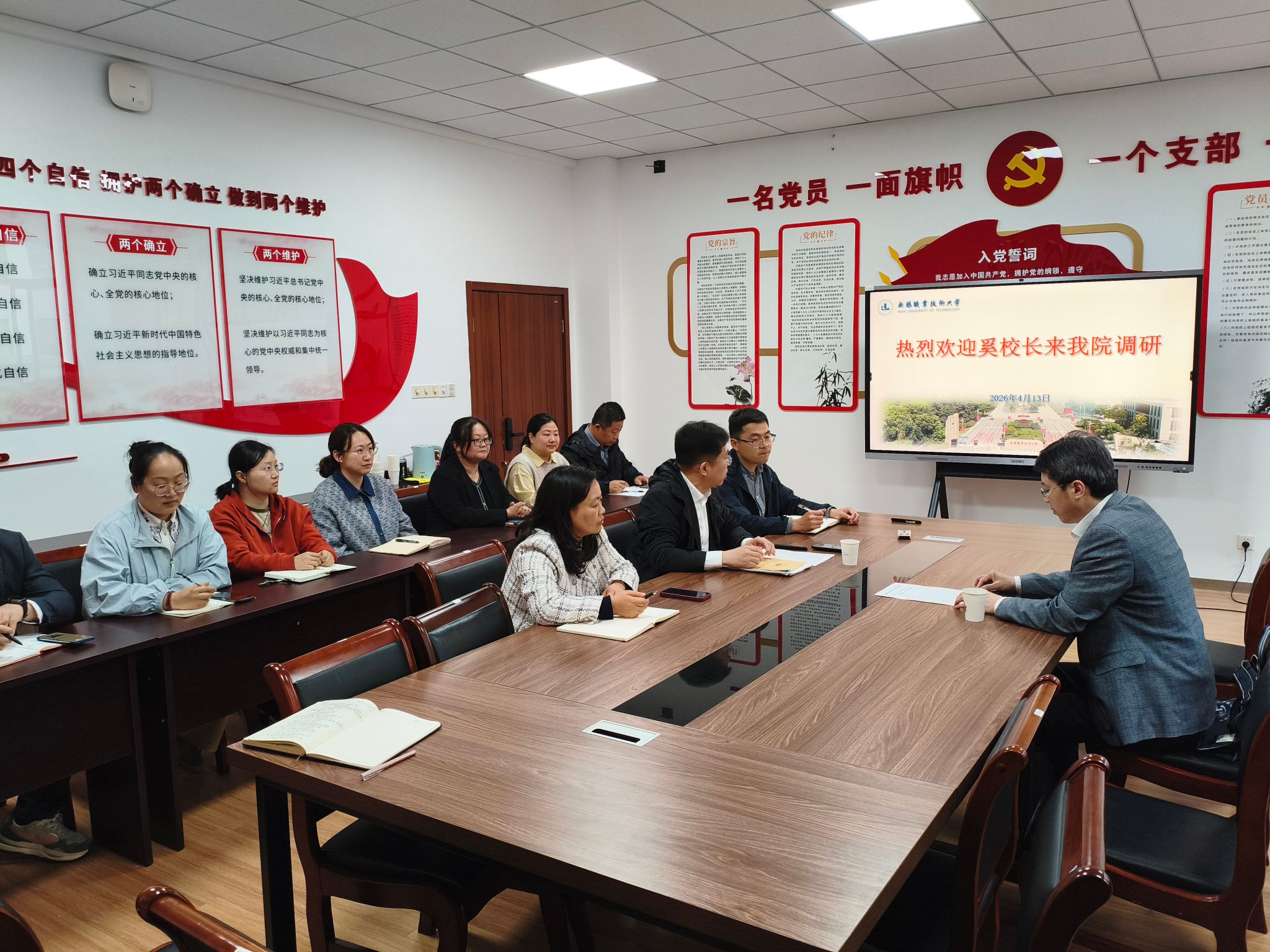 邹晔院长介绍了学院过去几年取得的成果,并汇报了学院的发展规划、专业布局及2026年重点工作。张美娟书记就学院党建工作和就业等情况作了详细汇报。焦祥副院长汇报了实训室建设及科研项目管理工作。